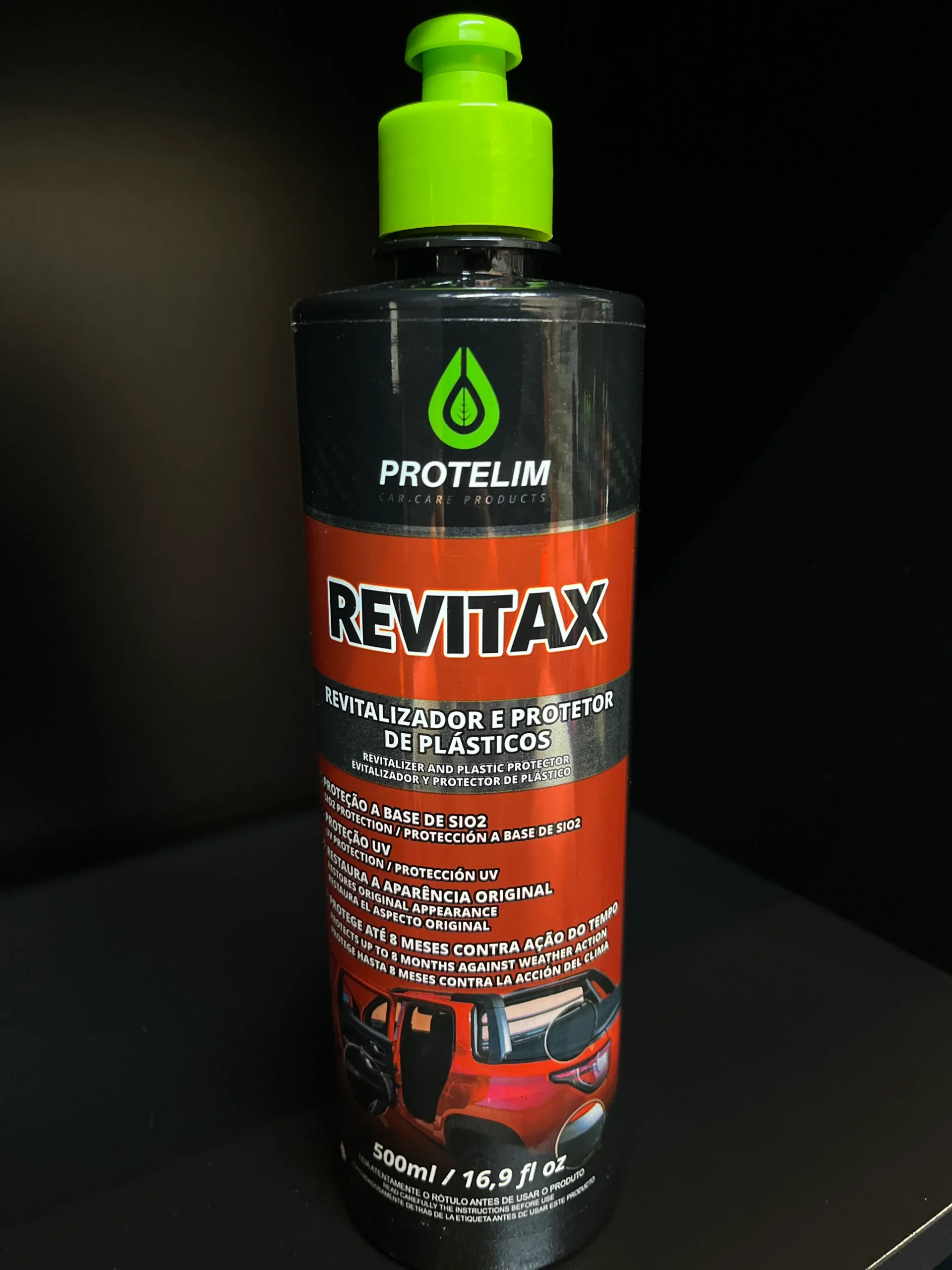 Revitax é um revitalizador e protetor de plásticos de última geração. Sua fórmula avançada contém SiO2, proteção UV, matérias-primas essenciais que revitalizam e protegem as superfícies internas e externas contra a ação do tempo e degradação precoce. Revitax restaura com qualidade diversos tipos de superfícies plásticas, vinil e borrachas, tais como para-choques, painéis de carro, laterais internas de portas e capotas marítimas. Revitax proporciona até 8 meses de proteção em plásticos internos e até 3 meses em plásticos externos.